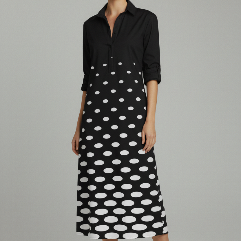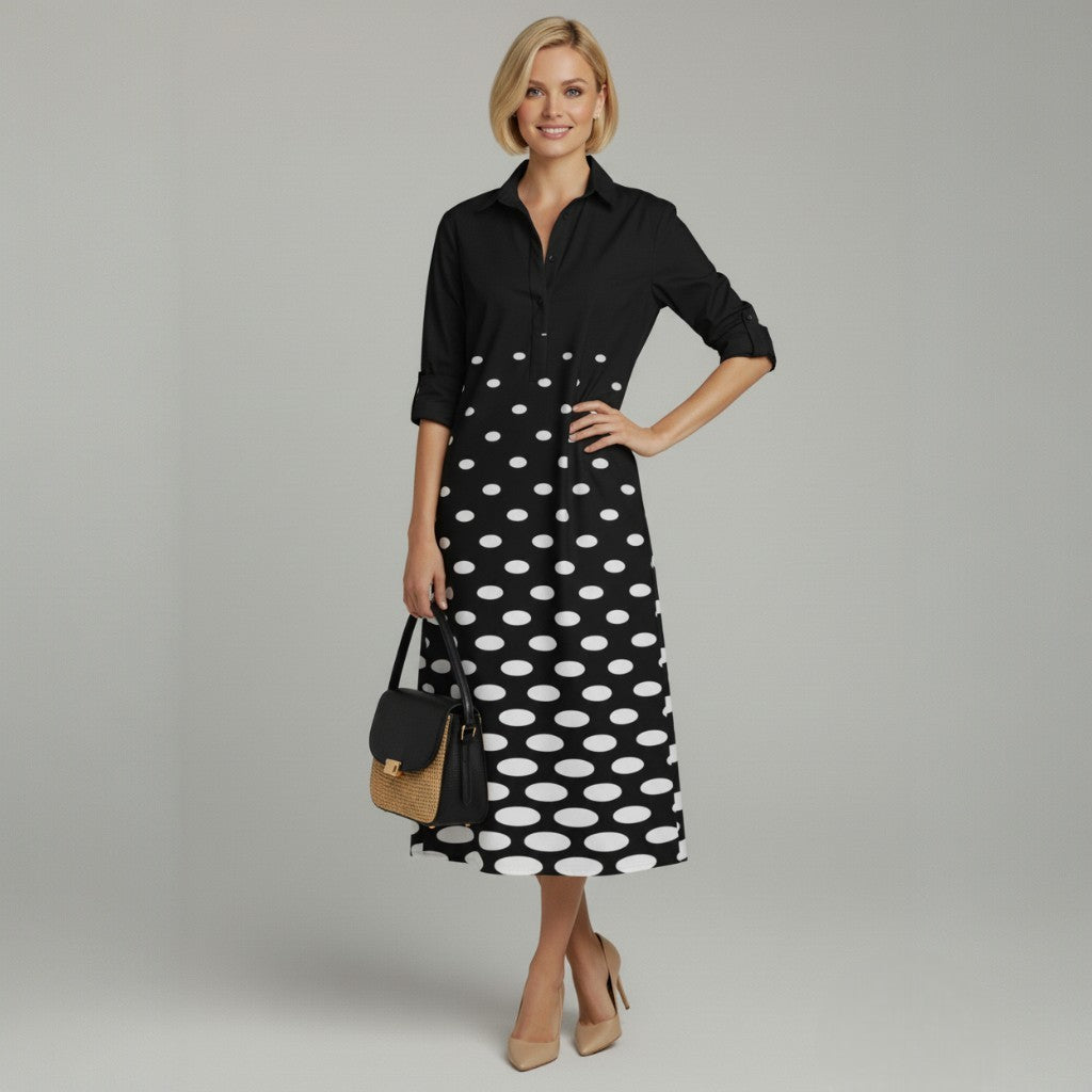 Elevate your wardrobe with the Daniela Polka Midi Dress, where timeless black elegance meets modern whimsy. With its stunning polka dot design, this dress promises to make you the center of attention at any upscale brunch or evening gathering.